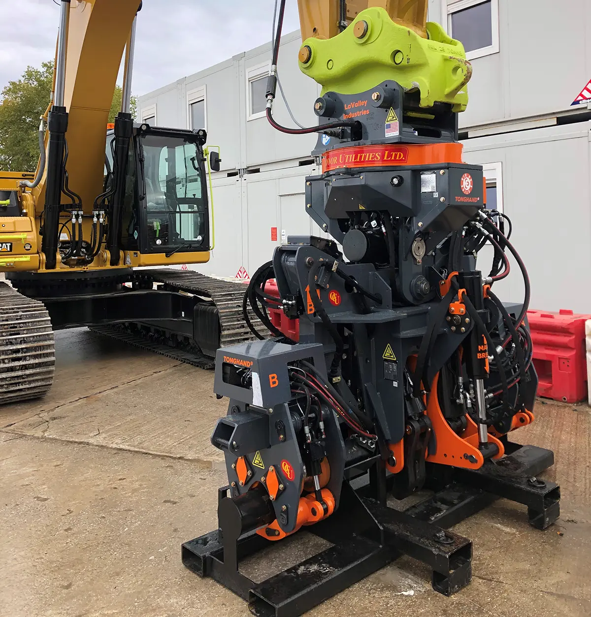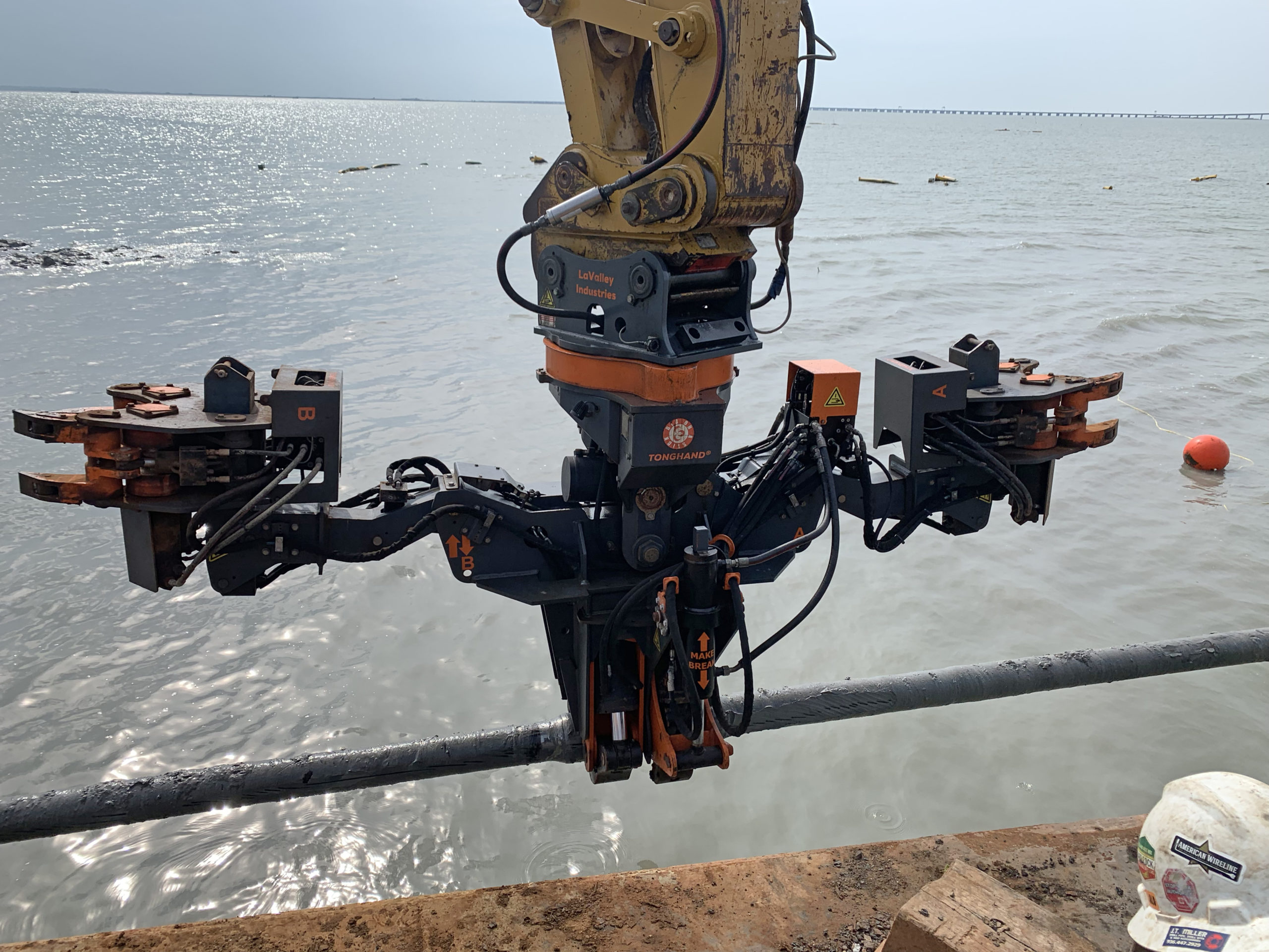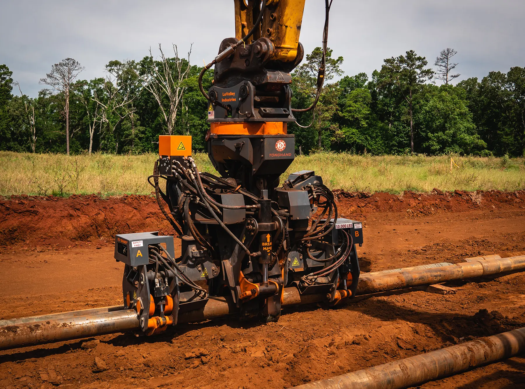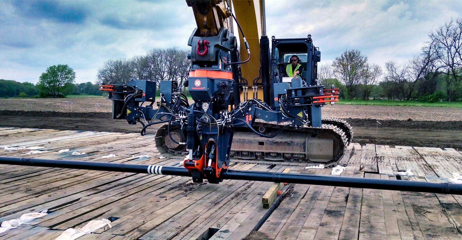 The TONGHAND® is a hydraulic excavator attachment that serves as the horizontal directional drilling (HDD) industry’s exit-side wrench and rod handler. It enables precision make/break of threaded drill rod, reamers, and pipe joints directly from the cab, eliminating unsafe torquing methods, removing personnel from working in danger zones, and boosting jobsite efficiency.