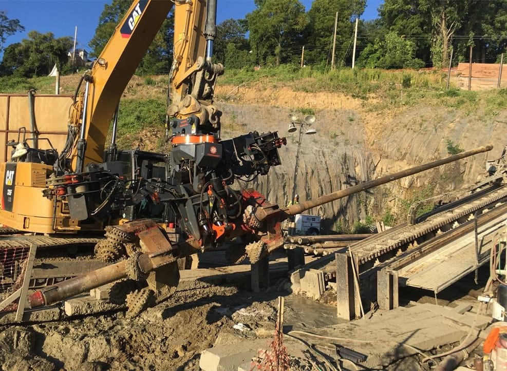 TONGHAND works with reamers (up to 60 inches), adapter subs, and drill pipe connections from 6.5-10 inches OD, and can handle drill strings up to 10 joints in length. It mounts to any brand of excavator, the excavator’s auxiliary hydraulics safely and efficiently power the TONGHAND.