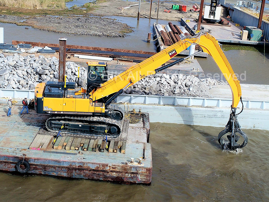 EIK Material Handling Boom is specially designed for efficient material handling solutions of bulk materials. The machine is designed from ground up, transforming from a standard excavator into a piece of highly sophisticated equipment. The most attractive proposition of an excavator-based machine is its fully hydraulic control, which is undisputedly more efficient, easier to operate and less costly to operate and maintain than any traditional crane- based material handling machine.